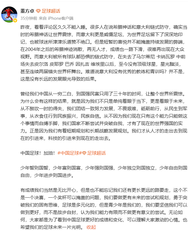 在对阵日本的决赛之前,在社交媒体表示,“很多人在说希腊神话和意大利链式防守,确实当时的希腊神话让世界震惊,而意大利更是威慑足坛,为世界足坛留下了深深地印记,也被球迷所津津乐道赞不绝口。但是短暂的喜悦并不能掩盖持续发展的弊端,在2004年之后的希腊神迹消散,再无人才,成绩也一路下滑,很难再出现在大众视野。”