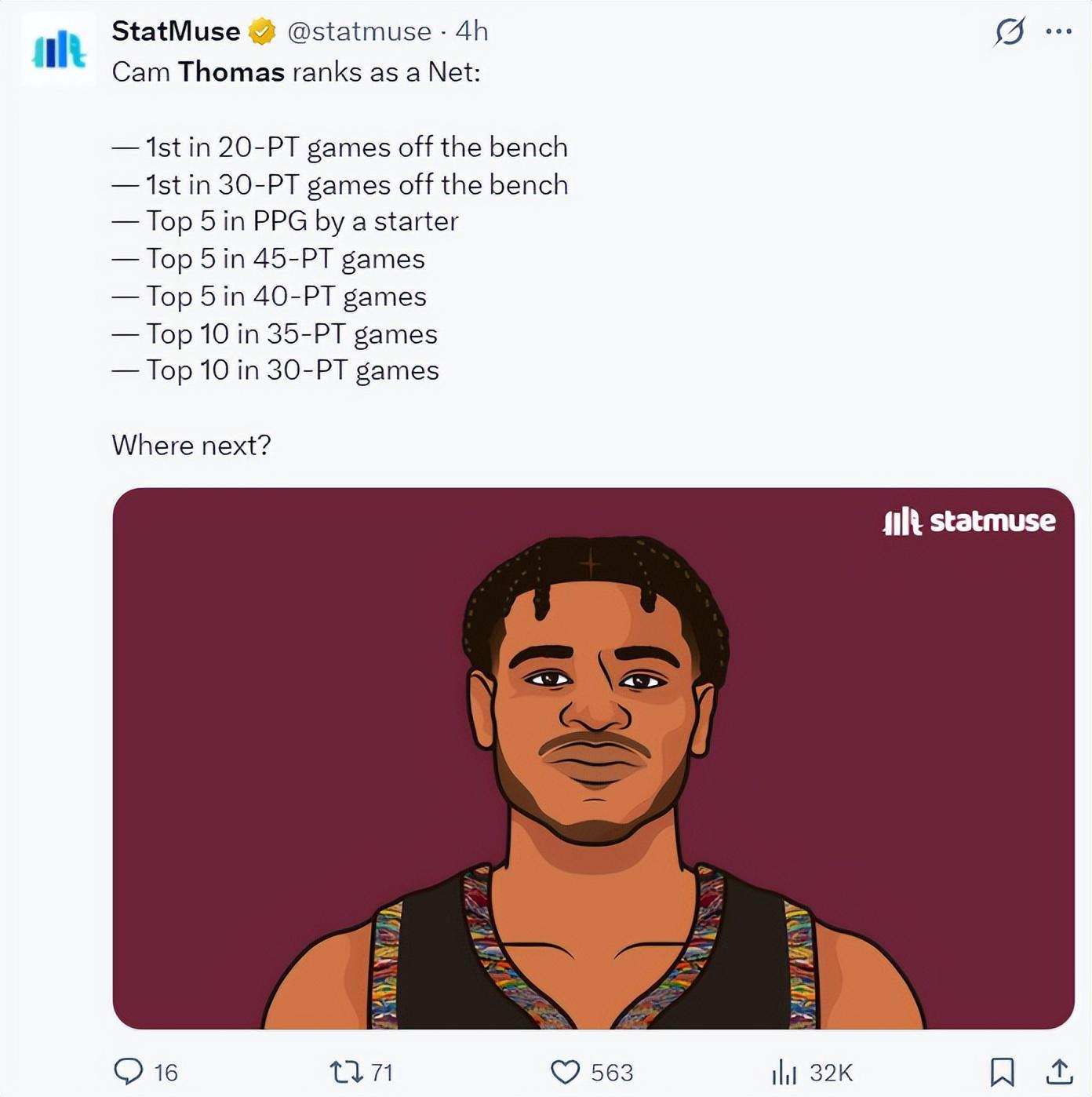托马斯本赛季在篮网场均15.6分3.1助攻,他在篮网打替补时20+次数第一、替补30+次数球队第一、先发球员中场均得分前五、45+场次前五、40+场次前五、35+场次前十、30+场次前十。总体来说托马斯是一个得分能力很强的后场。